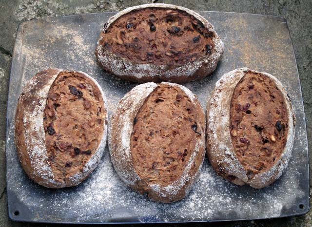 It’s fantastic bread though – wheat and rye flours, rye starter plus pecans and cranberries soaked in bourbon and orange juice. Mind it’s really heavy dough to work – moan, moan, moan.