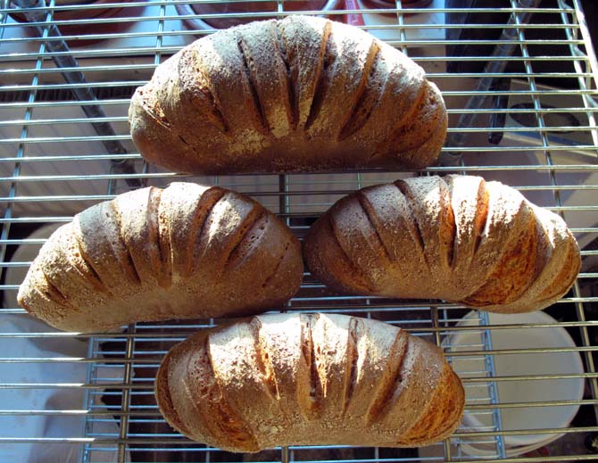 You were at Rick’s in August. Have you forgotten the mighty Gareth’s emulsion of equal quantities of olive oil & water (and salt – but that was a bit over the top for me). A litle spooned over the dough before baking and sprinkled with Halen Môn/Anglesey Sea Salt. The water helps the dough absord the olive oil and prevents burning (I’m always rubbing it on) and produces a thin golden crust (ditto).