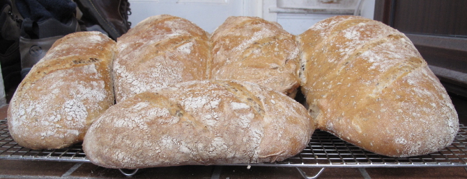 My rye’s were in couches in a hot kitchen longer than I would have wished. I have this technique, not recognised by classical bakers, of lifting the pleat of the couche and flicking the dough over onto my (hairy) forearm from where it gets turned over onto the baking sheet. Mon Dieux, the doughs were flat and stuck together, collapsed, got mangled, stuck to my arm, were hastily reshaped on the baking sheet where they were hopelessly crammed together. But these days I am long past panicking: