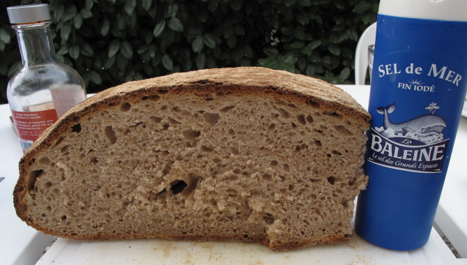The second loaf baked here in Arcachon in the tin box oven is a 2K Classic. Just a half-and-half mix of T65 Organic supermarket flour and T130 farine de blé intégral soft wheat flour. That’s a good 5-6 inches of crumb rather badly hacked about by a blunt chef’s knife (the owner has returned from abroad and “rationalised” the kitchen untensils – we still have an egg slicer but no longer a bread knife).