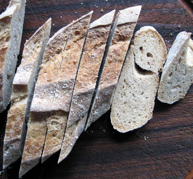 It was only a mini baguette made from a bit of left-over Normandy Rye Cider dough, but when I came to cut it for my ‘umble baker’s lunch, there it was: