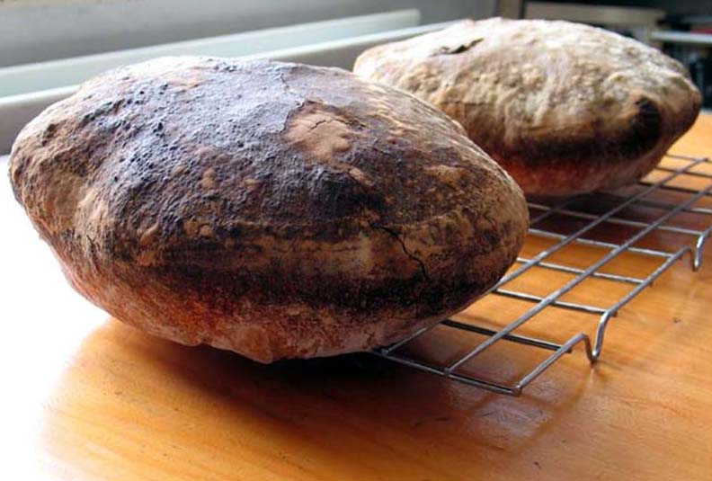 Amazing how things change given experience. I wouldn’t now be bothered about mixing by hand and didn’t have a problem handling the dough (66% is hardly very wet). I didn’t bother using baking parchment as an aid and it didn’t take courage turning the dimpled loaves onto the baking sheet. Still makes fantastic bread though.