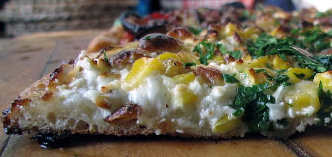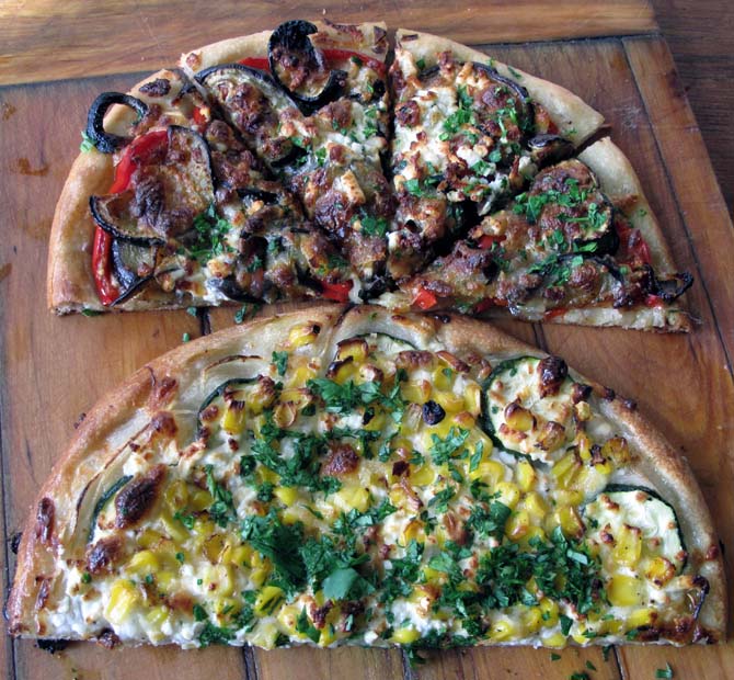 After a pretty neat seafood risotto made two pizzas – toppings from Cheese Board again: Aubergine & Red Pepper; Corn, Onion & Courgette with Coriander & Lime – same cheese layering as before.