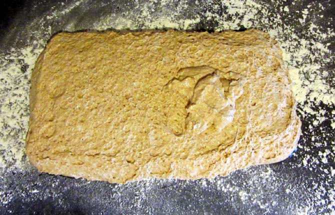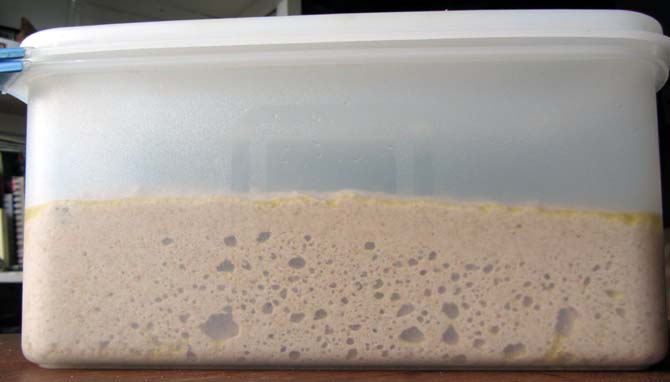 My kneading technique with very wet doughs is to push it away and scoop it back in a circular motion – the mixture never leaves the work surface or forms a coherent mass – it’s just too liquid for that. I don’t flour or oil the work surface. Then it was scooped into an oiled box and into the fridge overnight.