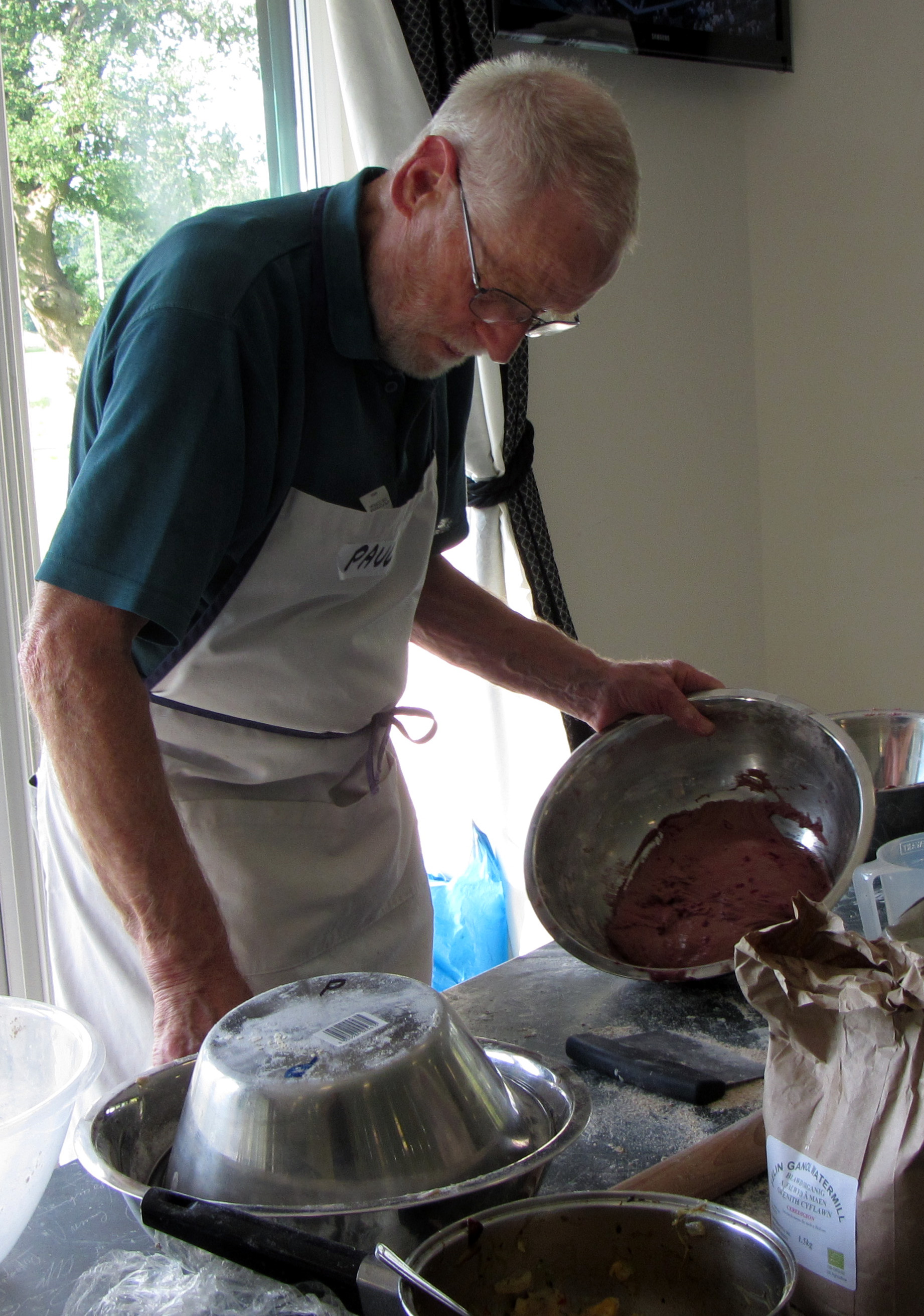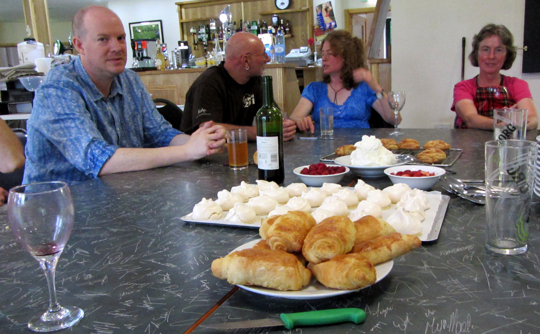 A final Sunday evening pudding. Raspberries, strawberries, Jack’s meringues, a big bowl of cream and, rather incongruous, pain aux chocolat. Gill and Chris finally getting into the picture: