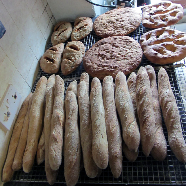 We turned out 24 large tomato breads for customers. To give Chris practice of shaping we produced 20 baguettes which we gave to customers as freebees. Chris hand-mixed five of my regular loaves plus three different flatbreads and one pure rye to take home. He definitely got a lot out of the opportunity to repeat moulding the same shapes until he felt he was really getting the hang of it in a way you can’t do in an amateur home bake.