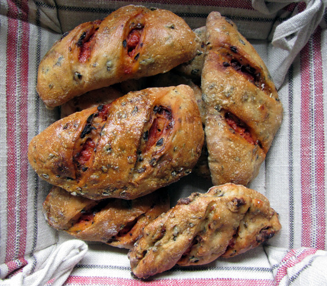 Some people learn by working their way from one end of a book like Jeffrey Hamelman’s “Bread”to the other.  I’m not knocking this approach and it’s an excellent book but I tend to develop by stealing ideas from less learned sources and quirky bakers. So I’ve got piles of cheap French (yeasted) bread books, remaindered books like the “Prairie Home Breads”, weird books like “Flavored Breads” from Mark Miller’s Coyote Cafe in Santa Fe and I plunder them all.