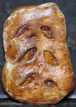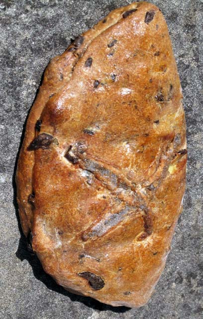The baker with whom I most identify is Marc Brion who has Le Fournil des Boiens in Biganos on the Basin d’Arcachon not far from Bordeaux. He bakes the most fabulous rustic pains aux levain. But he also has a way with improvisation for using up bits of spare dough or seasonal fruits. The “pasty” looking object pictured he calls “Fougassette” and, no, it’s not slashed but it’s two-layered. It’s a light olive oil dough containing chopped olives folded over a dollop of tomato sauce with a couple of anchovies on top.
