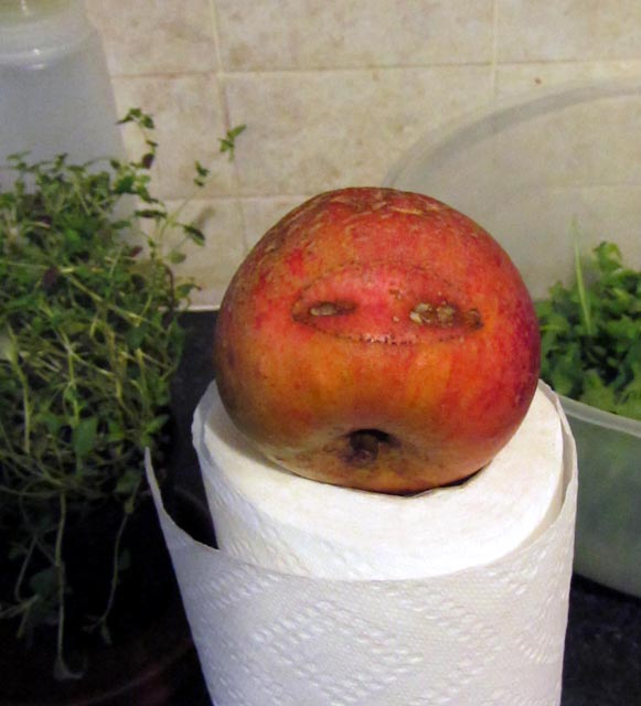 You will, of course, remember my post from August 2011 when we discovered the image of the BVM (Bethesda Virgin Mary) in a slice of Normandy Rye Cider (that’s it! the connection is cider!) well the parsnip soup was finished with a sprinkling of chopped apple fried in butter. Been a dreadful year for apples and Sue had managed to rescue a final one from the tree. When I came to peel and chop it, I couldn’t believe my eyes: