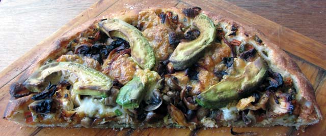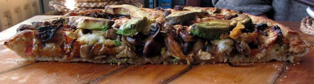 deep pan 02 smallI managed to take a few photos when we were groaning a little after sharing the first half. I made an uncooked Salsa Tipica (chopped tomatoes, jalapenos, onion, coriander, lime juice), fried an onion, mushrooms and the chicken. On top of these two layers sliced avocado and mozzarela. A pretty deep filling. I had a hearth of quarry tiles on the bottom of the oven which I heated to 250C. The tin went in at the top of the oven for 20 minutes, then 10 minutes on the hearth.