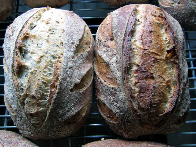 pot 002 smallPotato, Rosemary and Black Onion Seed has been in the repertoire for at least five years. I’ve tracked it back to Dan Lepard’s “Baking With Passion”. He says that, while the recipe came from Erez Komarovshy who has a bakery in Tel Aviv, the bread is identifiably that of Baker and Spice for whom Dan was working at the time. I would say that after several years of knocking it out, this version is identifiably mine.