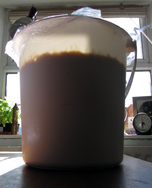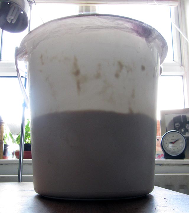 So here’s the baking equivalent of watching paint dry, a maturing bucket of starter – note the clock: