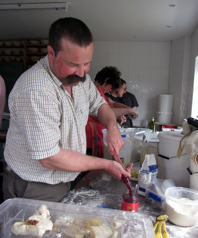 Next thing, back in the bakery, what’s he doing with jam in an icing bag and a bunch of bananas?