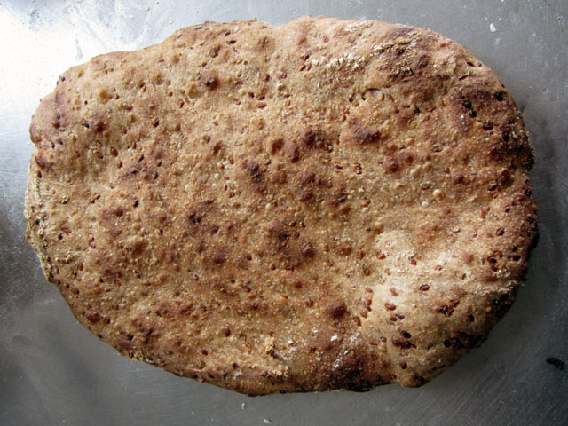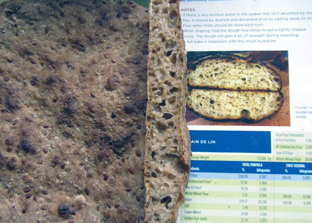 The latest edition of “Breadlines”, the Bread Bakers’ Guild of America’s quarterly journal has a recipe for Linseed bread from Steve Scott of Babette’s Artisan Bread in Denver, Colorado. The hydration is 110%. During fermentation you’re supposed to fold the dough several times. Ever tried to “fold” thin porridge? I did actually shape it and got it into a basket which was as big an achievement as I managed. It was supposed to prove for 15 hours but the oven man overslept and by the time the oven was ready it had been in the basket more like 20.