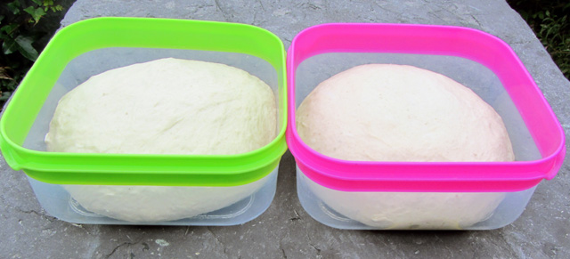 The dough on the right was stretched and folded three times every hour for the first three hours of a four hour fermentation. After four hours: