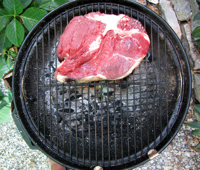 I know that doesn’t look very big but that is a T-Bone steak weighing just over a kilo and, as I had to admit to Sue, it cost 26 euros. It wasn’t really what I wanted – I was after a piece of beef half the length and twice the thickness that could be cooked partly by direct grilling and partly off the charcoal. But I try to explain this to Tony, of Chez Tony on the market, in my limited French and he thinks “the boy wants steak” and what is the boy to do on his last day in France?