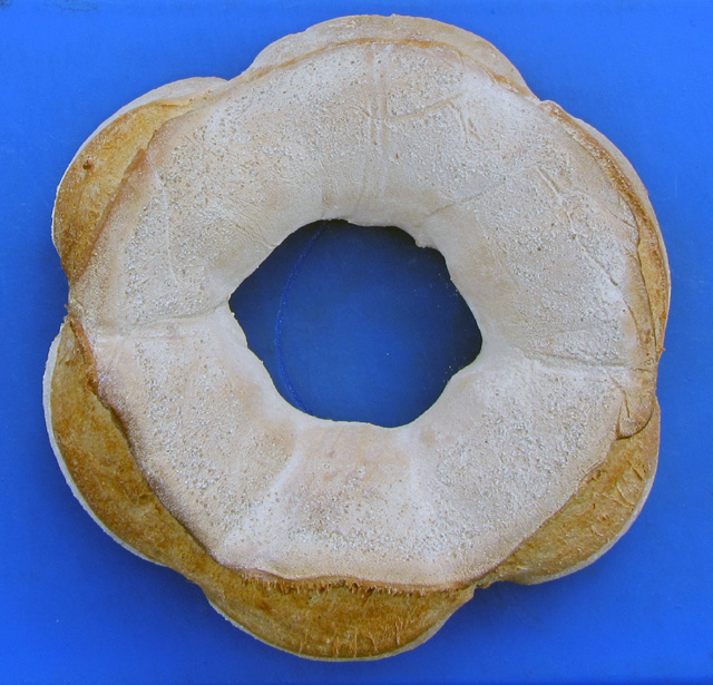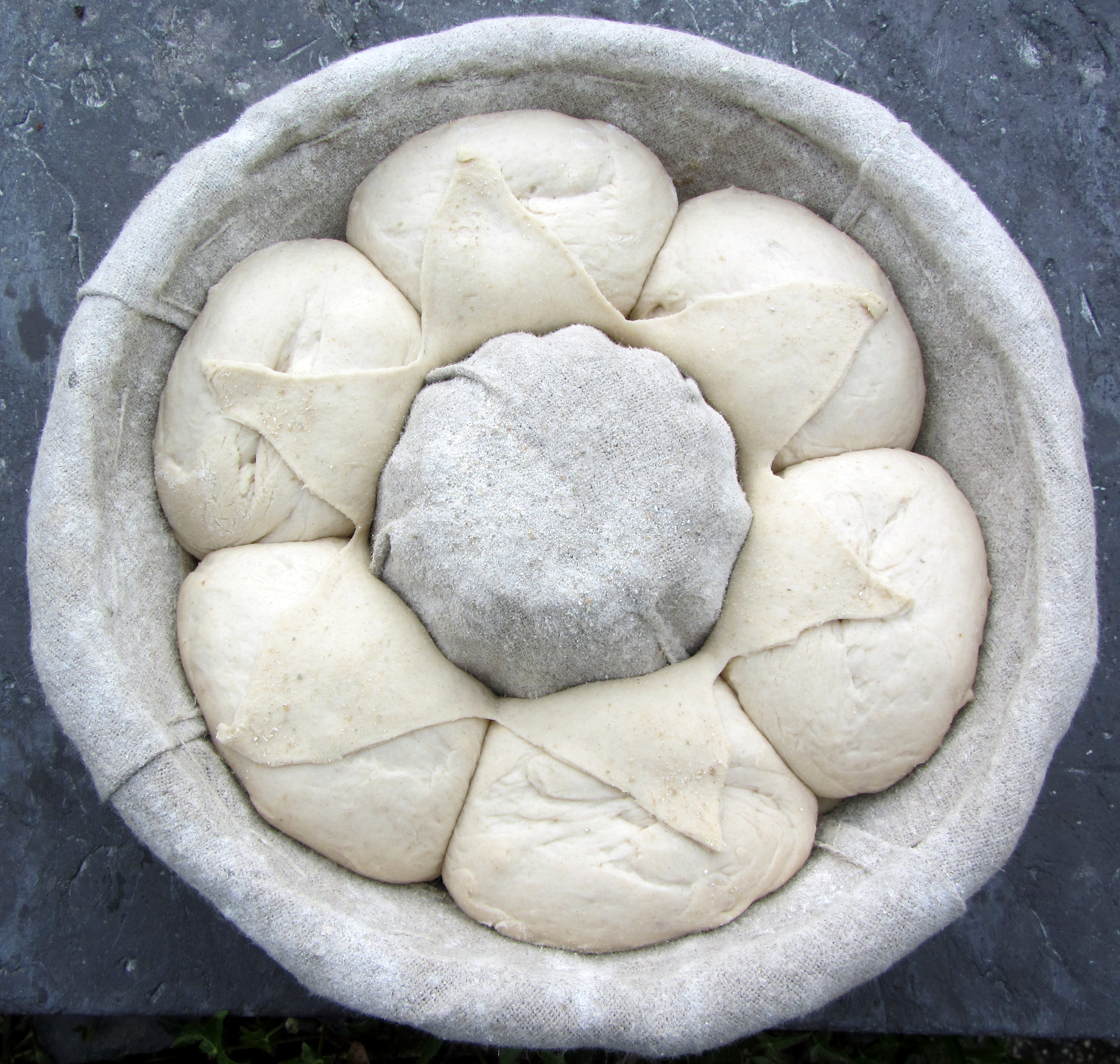 After proving the method is divide the dough into seven equal pieces (my first attempt they were 160g, second reduced to 130g – might reduce them further next time). Six pieces are formed into rolls, the seventh is rolled out like a pizza. This gets laid in the bottom of the basket, the outer edge of the circle is brushed with olive oil and the six rolls are spaced equally on top. Then then dome section is cut into six and folded on top of the rolls: