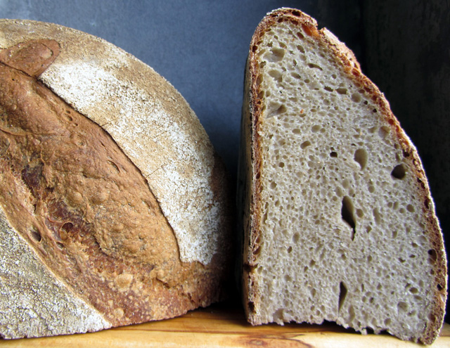 Two weeks, two new breads from famous bakers. The daughter of one of my customers moved back to Wales from France with her Breton husband who, of course, was soon raving about my Pain de Campagne. So I poked around the net for a Breton bread to have a go at. The only thing that came up was a couple of versions of a bread by Real Bread Campaigns’s poster boy Richard Bertinet containing sel gris and some buckwheat flour. Spar Bethesda was fresh out of sel gris but I had some buckwheat in stock. The original recipe is yeasted but called for 30% pate fermentee so I just swapped that for starter.