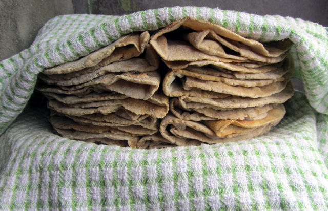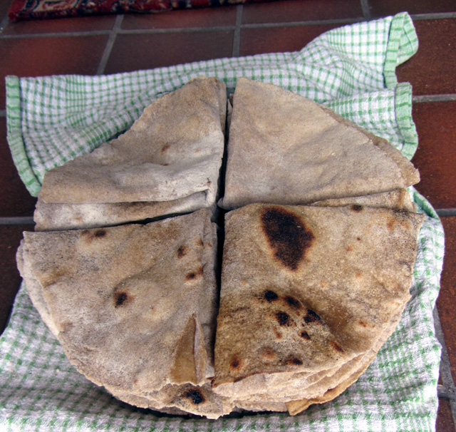 Interesting genuine sourdough flatbread with a good whack of barley flour cooked on a wok inverted over the gas. The hydration was hugely out – nearly broke my wrist trying to knead it. I added so much water I started to think my calculation was out but I’m pretty sure it wasn’t. Not sure either about the wok business – I know they use a copper dome in Lebanon but I can’t see any advantage over using a cast iron skillet (I’ve started doing wheat tortillas on a Welsh bakestone).