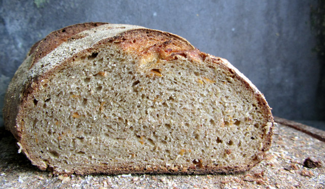 This is grunkern-karrotenbrot. Not the most photogenic of breads but one that supplies a big smack in the mouth courtesy of the grunkern which is wheat (or spelt) that has been harvested green and roasted.