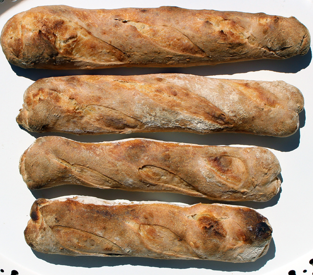 With the scrap leftover pizza dough (80% hydration) about three days in the fridge, stumpy rustic baguettes, proved as long as it took for the oven to heat up.