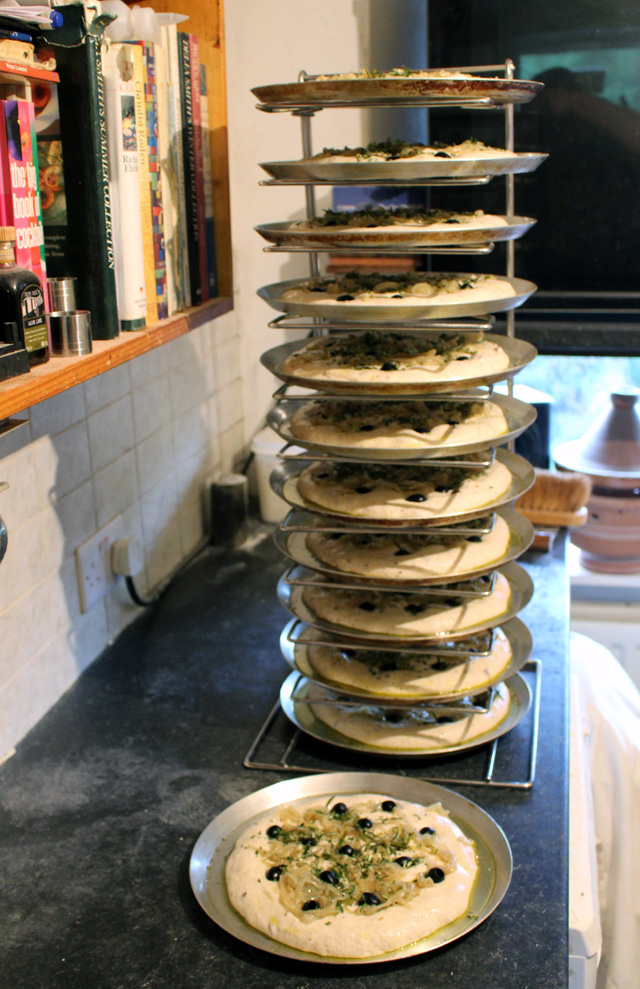 First bake for about ten weeks what with having time out in France and trying to do some serious writing. 30 large ones and 12 Black Olive, Rosemary and Caramelised Onion Focacca: