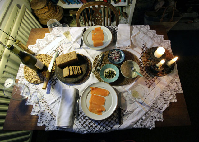 Christmas lunch, first course, got to be simple. Table laid with linen, antique family tablecloth, candles, champagne in the flutes, nice Touraine lined up, Pysgod Mark’s very fine smoked salmon matched with my thinly sliced Borodinski, minimal accompaniments – shards of red onion, a few capers, mildish horseradish sauce.