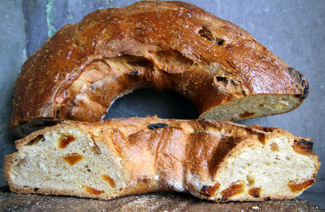 Bakers, as you know, never have bread for themselves. Instead of dipping into my large repertoire of breads when the supply is getting desperate I usually do the unimaginative and run up a white campagne or a classic. But I’ve got that rye starter sitting there looking at me and the last rye I made was months ago. So on Friday I went to two extremes and ran up a Cider & Apple Rye (100% rye) and a Torth Santes Dwynwen (it’s not Dwynwen’s saint day for months but I also had a heap of apricots looking at me).