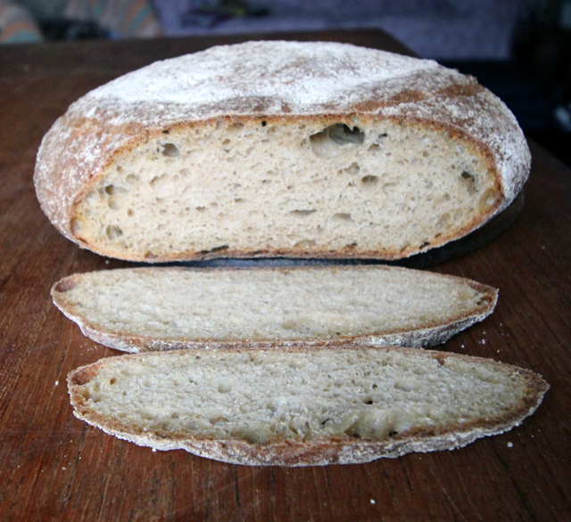 I don’t deny that long cold fermentation develops flavour (or at least acidity) but I’m sure it’s also used because wet doughs are easier to handle when they’re cold (this is 87.2% hydration). The starter, the flour and the fermentation all contribute to flavour but which is the most important and what is the best balance of these elements? I tend to regard the starter as being just the engine to lift the dough, and, so long as fermentation is adequate, I lean towards the flour.