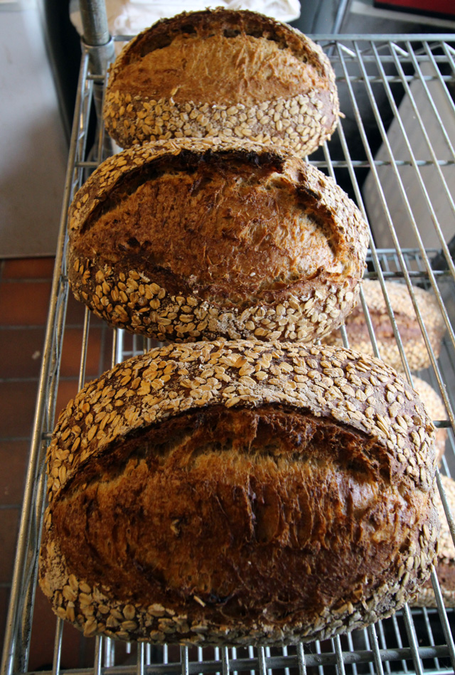 Now that my ulcerated leg is nearly better I need a new baking plan. I’m not going back to 40+ large loaves at a time and I’m abandoning the mixer – hauling out kilos of dough from floor level is gut-wrenching. So I’m experimenting with baking 10 loaves per week, just one dough instead of a variety. Ten loaves because I can hand-mix that many and ten is my oven capacity so that’s just a single bake. Remains to be seen how my customers take it. Some weeks it will be a mad scramble for a loaf and others I shall be using my powers of persuasion. First week: Oat and Honey.