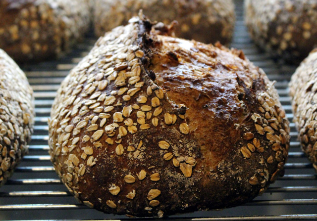 Coating the doughs with oats is simple when you know how. You need two trays one containing a wet tea towel and the other the oats. Roll the shaped dough on the tea towel and then in the oats. They stick well, but still expect them to get everywhere and again when you cut the bread. It’s worth it for the taste and the appearance of the loaves.