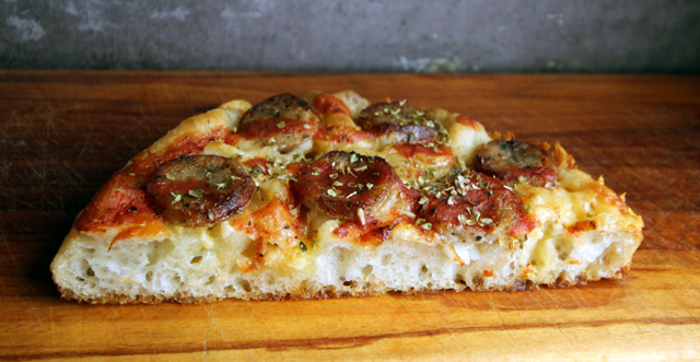 Continuing with Peter Reinhart’s Perfect Pan Pizza: Garlic Lovers’ Italian Sausage.