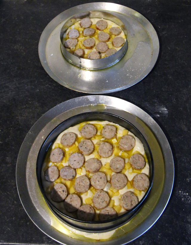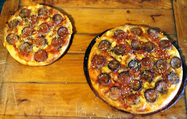 Baked for getting on for 20 minutes at 240C adding a few squirts of pizza sauce at half time and finishing with a sprinkle of oregano. Note the larger one leaked a bit – buckled cake ring!