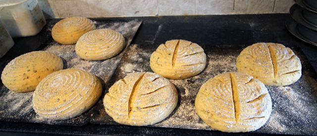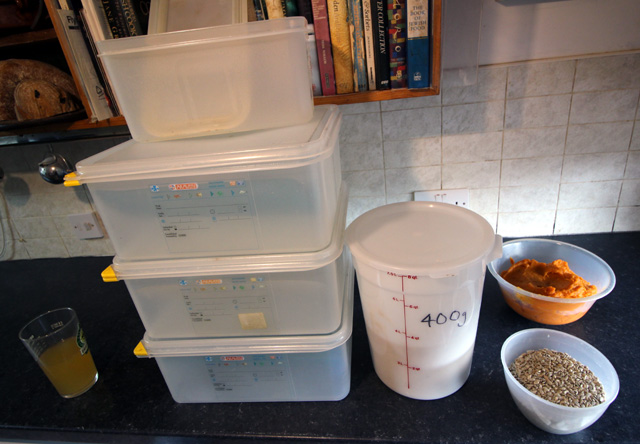 This seemingly innocent picture is perhaps the most important of all. It’s called prepping. Yesterday the butternut squash was gently roast with olive oil and a scattering of chile flakes then pureed. The sunflower seed has been toasted in the oven and cooled. The dough boxes washed and dried. The starter is on the rise. The cider level is going down. A state of relaxed harmony is developing. Lunch is on the way.