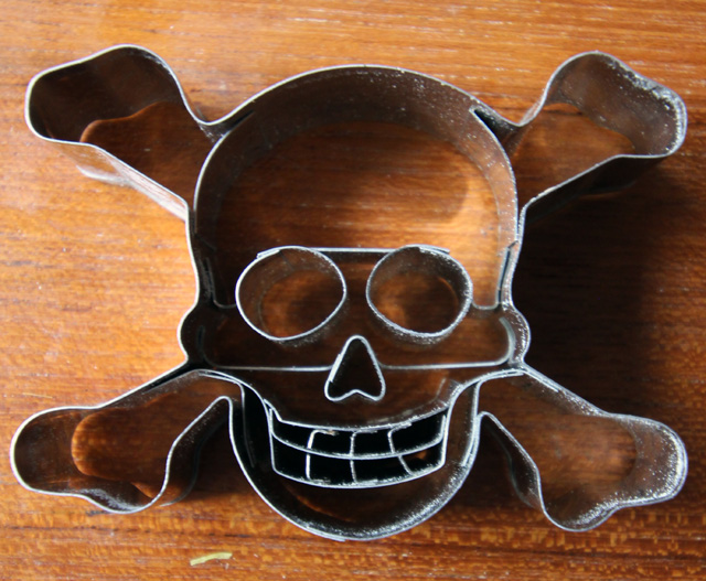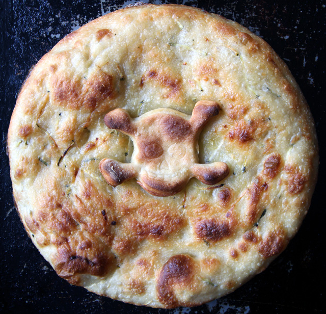 With Halloween fast approaching, in the quest for a way of weaponising my prototype Vladbread so that it actually looks a bit scary, I pulled out my trusty skull and crossbones biscuit cutter. This week’s customer flatbread is Courgette & Parmesan so I hijacked a spare and cut out the shape from a bit of white dough.