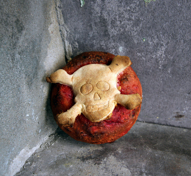 This is more or less what I’m after. This time I made the skull & crossbones from a pâte morte (unleavened dough) and baked them in advance. Too hard – might try shortcrust pastry next time.