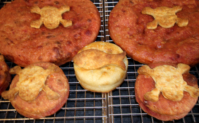 Rick & Maggie (Mair’s Bakehouse) suggested their cheesey short-crust pastry for the Skull & Crossbones because the unleavened dough was too tough. The pastry was really nice but a bit too fragile.