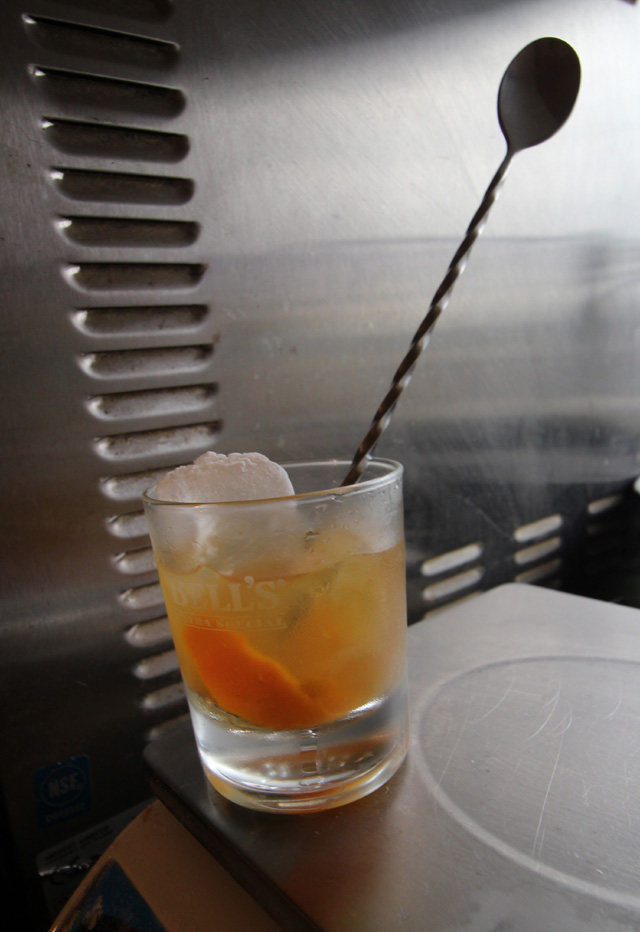 This is a cocktail that is “built”. A teaspoon of sugar is put in a glass followed by a couple of strips of orange peel (just the zest), a few shakes of bitters and just a drop of whiskey.