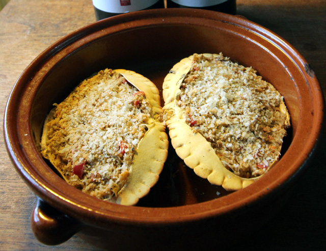 For Valentines Day itself, we started with Crab Backs. Comes from our ancient, battered, stained copy of Kenneth Gardnier’s Creole Caribbean Cooking – crab meat mixed with a little fried onion, allspice, chives, Worcestershire sauce, rum, lime juice, bread crumbs – stuffed into shells and baked.
