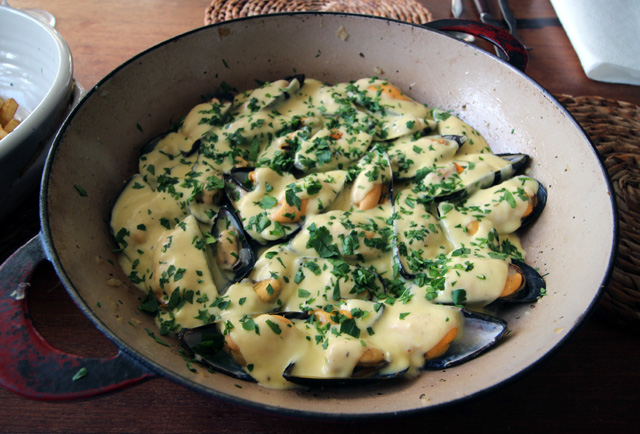 Moules Poulette comes from a great little French seafood book Cuisiner Les Coquillages which set me back a whole 5 euros a lot of years ago. There are more than 20 recipes for mussels alone and Poulette is my current fave.