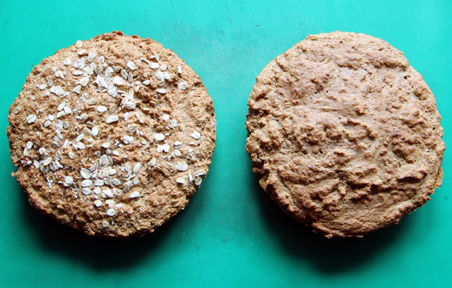 So, on to the comparative stuff. Two identical breads, one using Carrie’s nameless liquid (with a sprinkling of oats for identification), the other, yoghurt (+ a bit of milk). Dough weight 480g.
