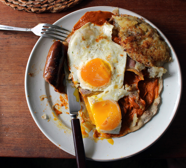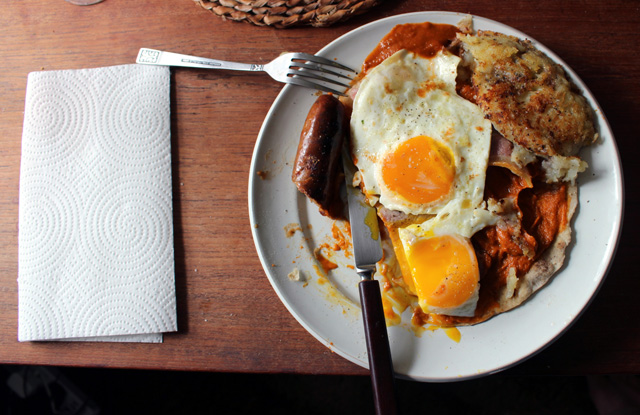 Hence the sort of Mexican All-Day Breakfast below, Mick’s wheat tortillas, enchilada sauce, bacon, Mentor Pandy eggs, proper hash browns, yesterday’s left-over sausage (another rare breed), Mick’s Patent Tomato Ketchup.