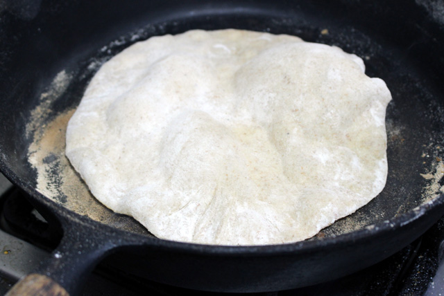 Retreat to the rolling area and start with the next dough ball – once you get into a rhythm you can roll one out as the one in the pan cooks.