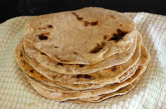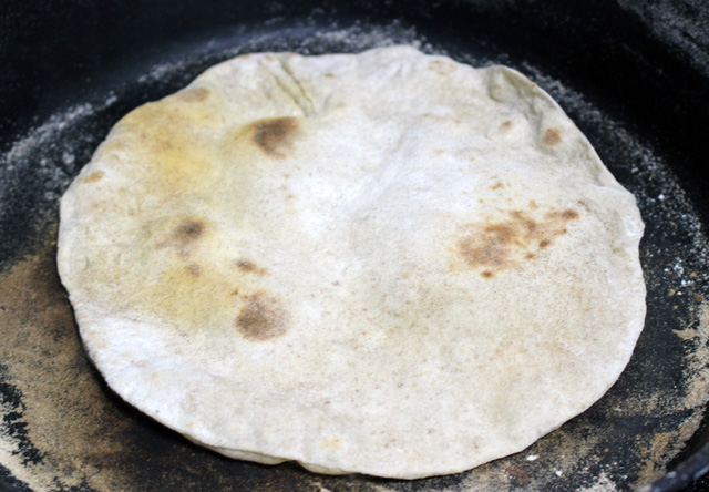 Get rolling. Roll out maybe five tortillas before you start to cook. Roll them as thin as you can, give them a little stretch with the flat of your hands and line them up in order of rolling.