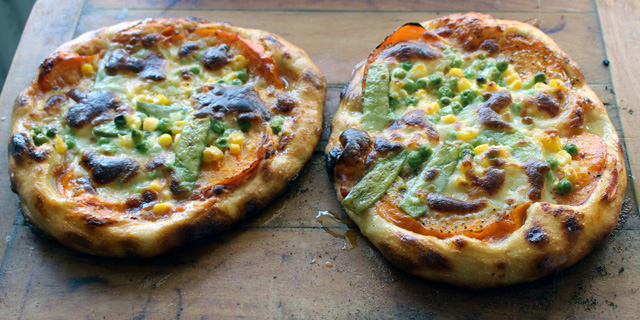Went for the limit, 340C top and bottom. Improvised a topping. Uncooked tomato sauce, a layer of grilled orange beef tomato slices, another of mange tout, peas and sweetcorn mixed with just enough butter and creme fraiche to scare off the vegans, slices of mozzarella.