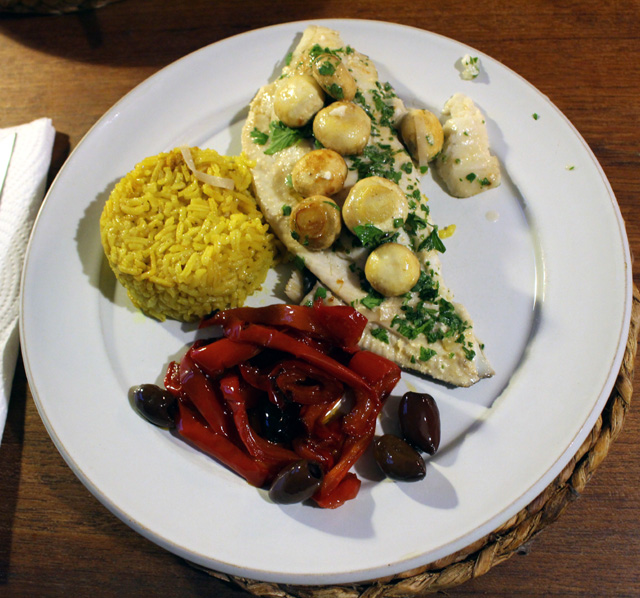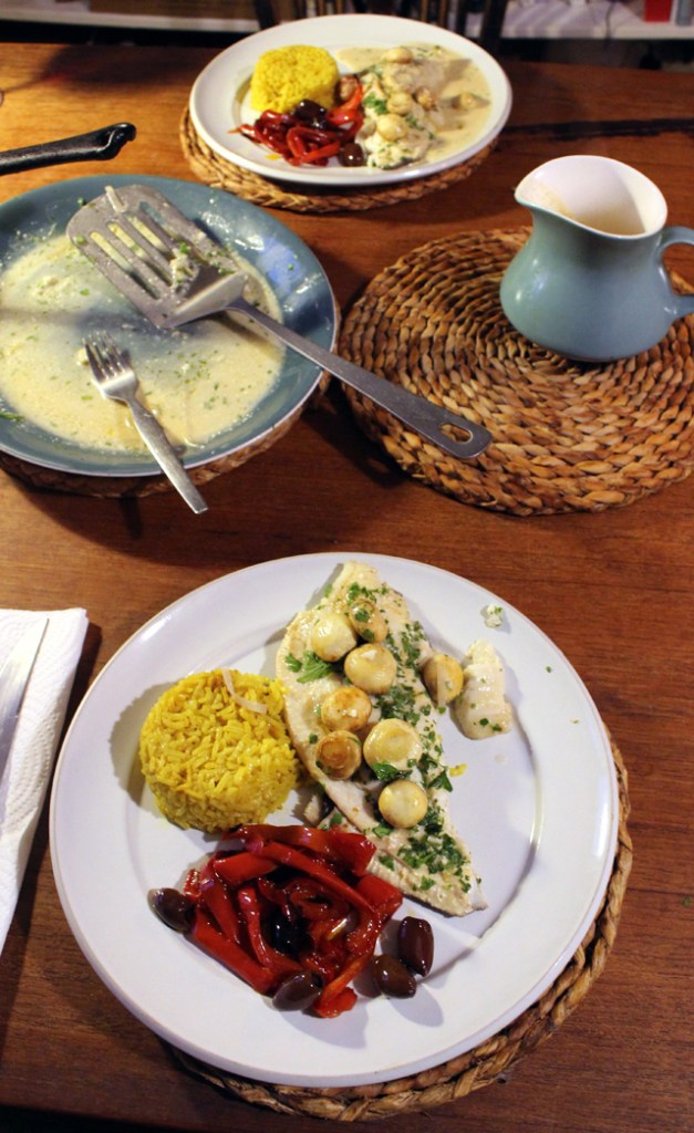 Then Barbue Vallé d’Auge from Jane Grigson’s Normandy Cooking – Brill poached in cider with leek and apple, the liquid reduced to a sauce with creme fraiche, served with (big) button mushrooms plus roasted red peppers and black olives plus rice.
