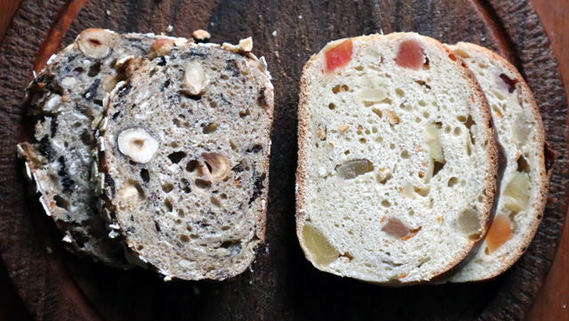 On the right, Brioche de Noel which in other circumstances features as Brioche Provencale. A brioche dough was about the first enriched dough I developed. I was never interested in perfecting the classic French brioche, all butter and eggs. Much happier with the idea of a “poor man’s” brioche with greatly reduced amounts of both. Nothing clever; just took the proportions from an undistinguished little French baking book and converted it to natural leaven. Worked fine though, as you would expect, rising times had to be increased. The Provencale bit came from a great bakery, Le Temple du Pain, at the top end of the Flower Market in Nice. The market had stalls selling the most wonderful preserved fruits. The baker made incredibly soft swirls, not formal couronnes, more large free-form circles of brioche peppered with preserved fruits and sold it by weight – you just indicated the length you wanted.