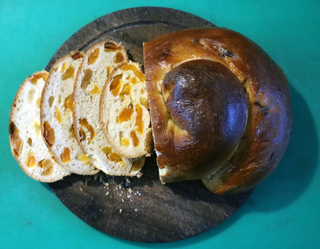 The problem with Torth Santes Dwynwen is it’s stuffed with apricots and the apricots were somewhere on the A55 from England with Mr Amazon. Tracking gave me a two hour slot so took a chance, knocked up the dough anyway. Half way through fermentation they arrived. But a nasty case of multi-tasking resulted in the kitchen floor being covered in broken glass, awash with cider. In the rush to get the apricots chopped and in the dough I clipped the top of my pint pot and it crashed onto the quarry tiles below. Don’t think I succeeded in hiding my feelings.
