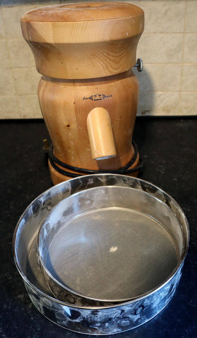 So now, with my mill and two sieves I can produce four grades of extraction: straight milling = Wholemeal; what stays in the the first sieve = Bran; what’s left in the second sieve = Middlings; what goes through both = Extraction.