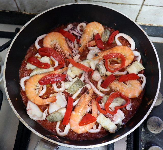 Today, completely unplanned, I made a seafood paella with stuff from the freezer – raw crevettes, a squid and a bit of cod fillet + prawn stock – always make some when you shell prawns.